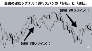 そして、もう一つの主役が【遅行スパン】です。 これは、「今日の終値」を「26日前の過去」に書き込んだだけの線です。