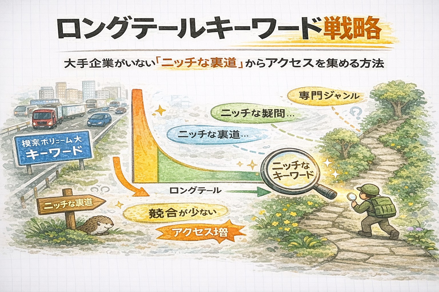 この記事は、あなたが無謀な正面突破をやめ、誰もいない裏道から確実に客(アクセス)を奪い取る、個人ブロガー最強の生存戦略【ロングテールキーワード戦略】の講義です。