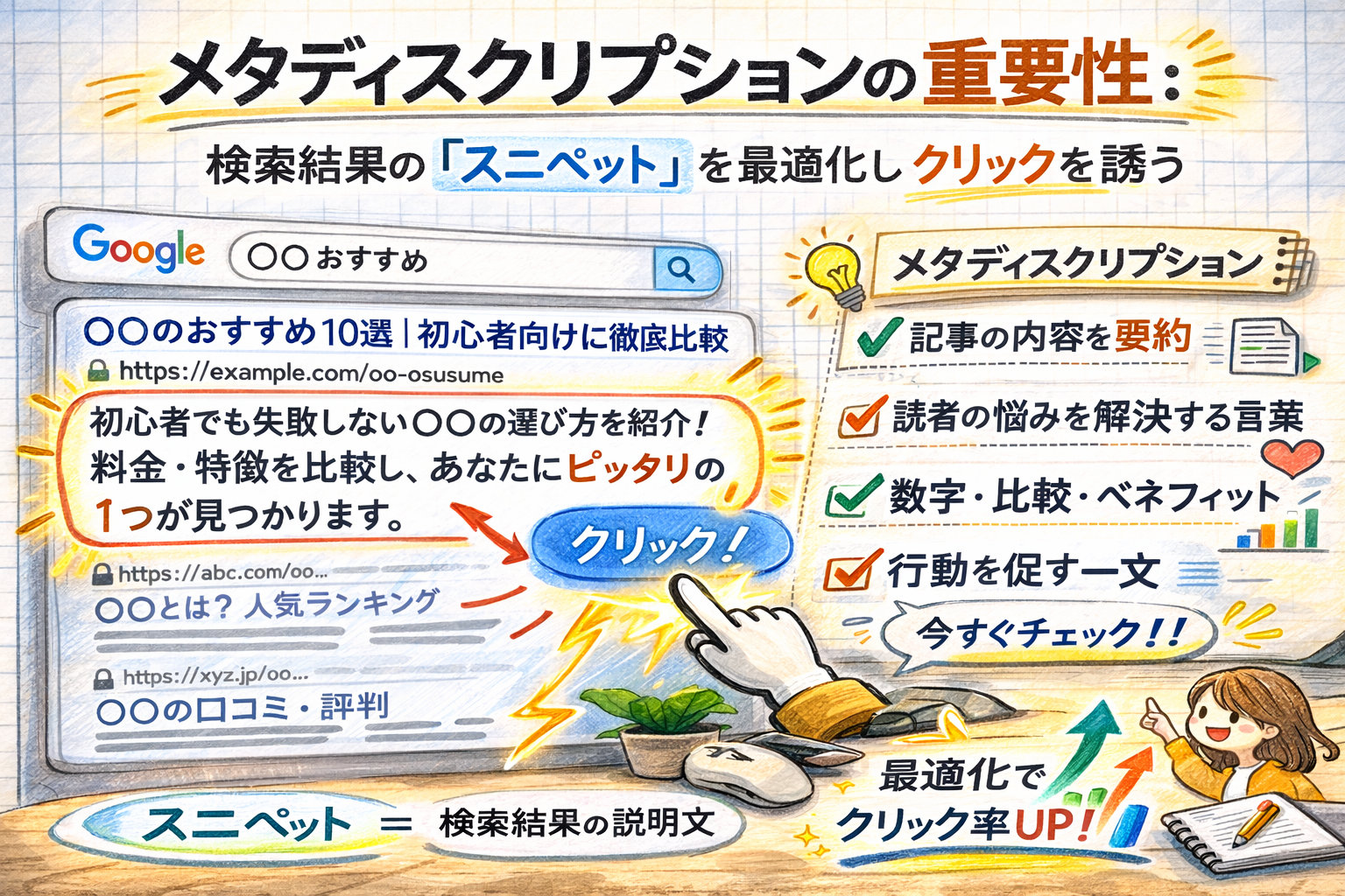 この記事は、検索順位を上げるだけでなく、「実際にクリックして店に入ってもらう」ための最後の一押しとなる、メタディスクリプションの設計戦略について解説します。