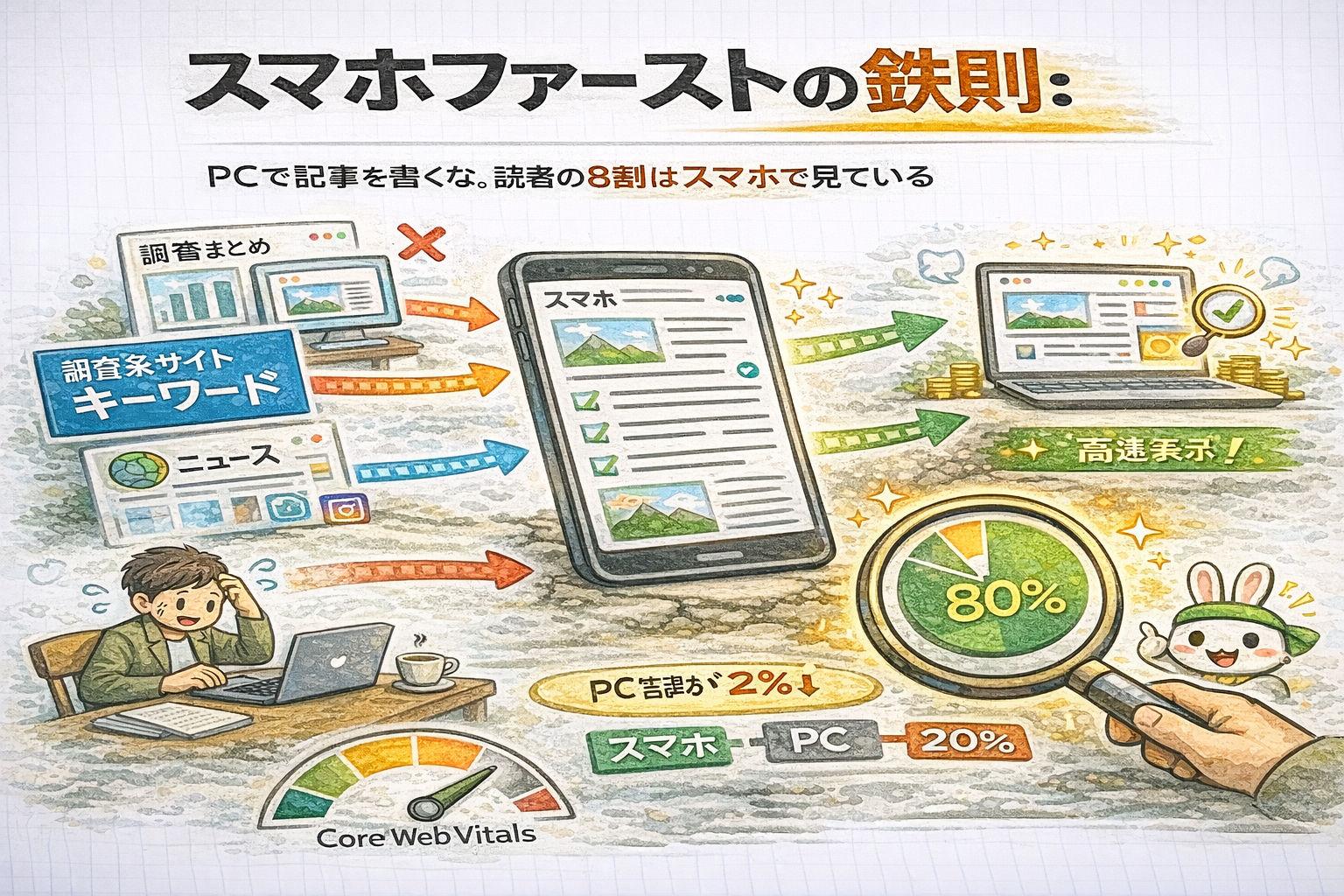 この記事は、発信者(PC)と受信者(スマホ)の間に横たわる決定的な「環境のズレ」を修正し、現代のWebライティングにおける絶対ルール【スマホファースト】を徹底するための講義です。