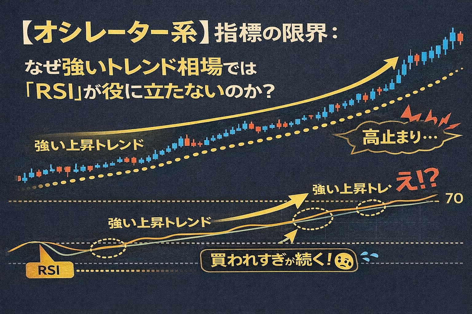 RSIなどの【オシレーター系】指標は、特定の環境下では無敵の強さを誇りますが、ひとたび「強いトレンド」が発生すると、途端に役に立たない「ガラクタ」と化します。