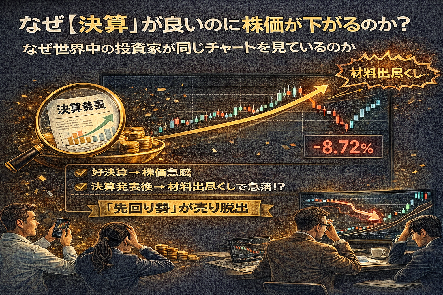 この記事は、投資家を絶望させる「材料出尽くし(Sell the Fact)」という現象の正体を暴き、理不尽な値動きに振り回されないための、投資家心理の講義です。