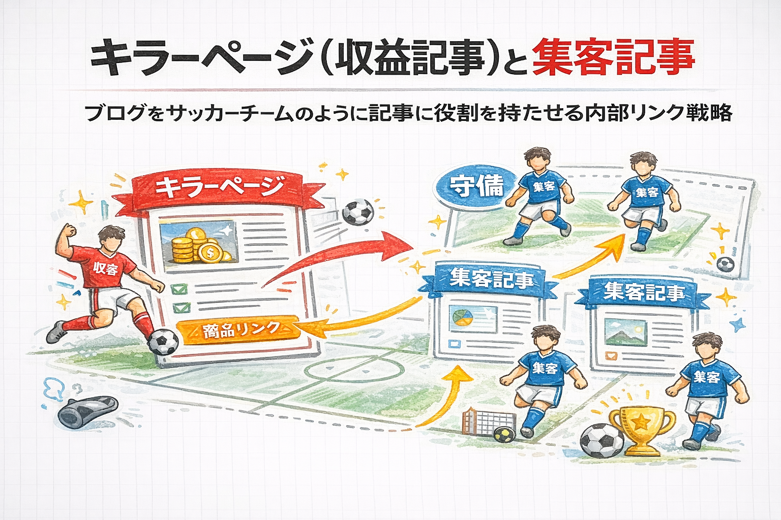 この記事は、ブログ全体を一つの「サッカーチーム」に見立て、個々の記事に役割を与えて勝利(収益化)するための、チームビルディング講義です。
